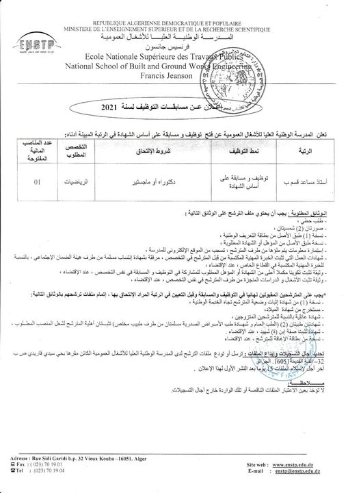 إعلان عن توظيف أساتذة مساعدين قسم "ب" بالمدرسة العليا الوطنية للأشغال العمومية - 2021
